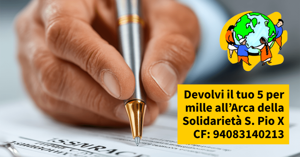 La normativa fiscale italiana consente di destinare alle ODV come l’Arca della Solidarietà S. Pio X il 5 per mille delle imposte versate. Non si tratta di pagare qualcosa in più, ma di devolvere una parte delle proprie imposte. Vi basterà indicare nell’apposito spazio del CUD, del modello 730 o UNICO il nostro codice fiscale: 94083140213